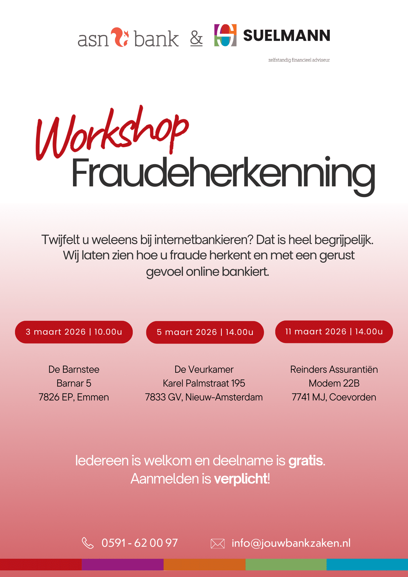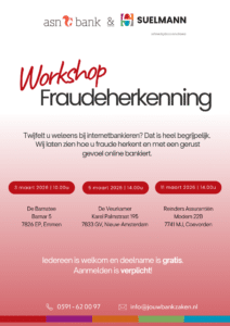 Omdat wij merken dat deze vorm van oplichting veel impact heeft, organiseren ASN Bank & Team Suelmann, zelfstandig financieel adviseur begin maart een workshop fraudeherkenning.