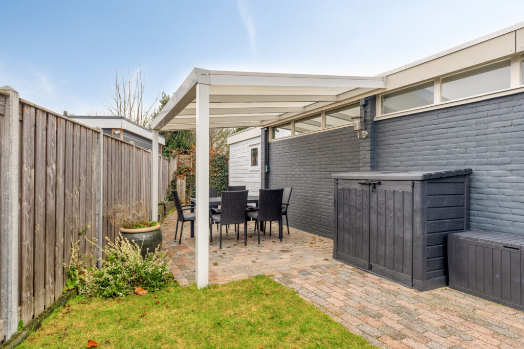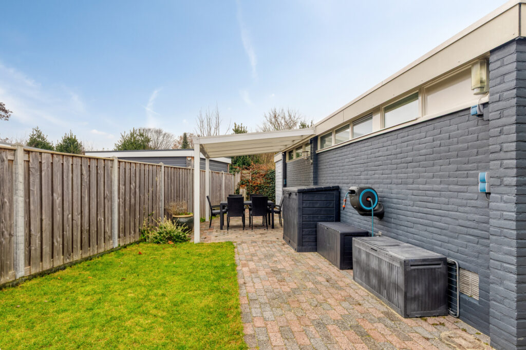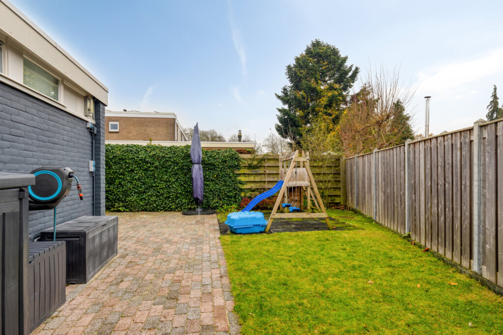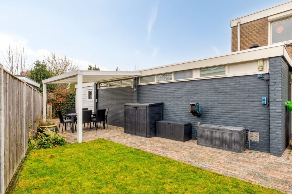 De goed onderhouden tuin (ca. 66 m²) ligt aan zowel de voor- als achterzijde, met een fijne ligging op het westen aan de achterkant. Daarnaast is er een aangebouwde stenen berging voor extra opslag. Er zijn twee overkappingen waardoor er altijd een fijn plekje te vinden is in de tuin.