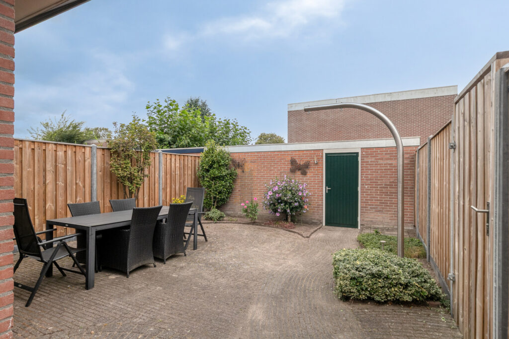 Een ruime voortuin (ca. 65 m²) en een onderhoudsvriendelijke achtertuin (ca. 65 m²), met achterom en vrijstaande stenen berging voorzien van elektra.