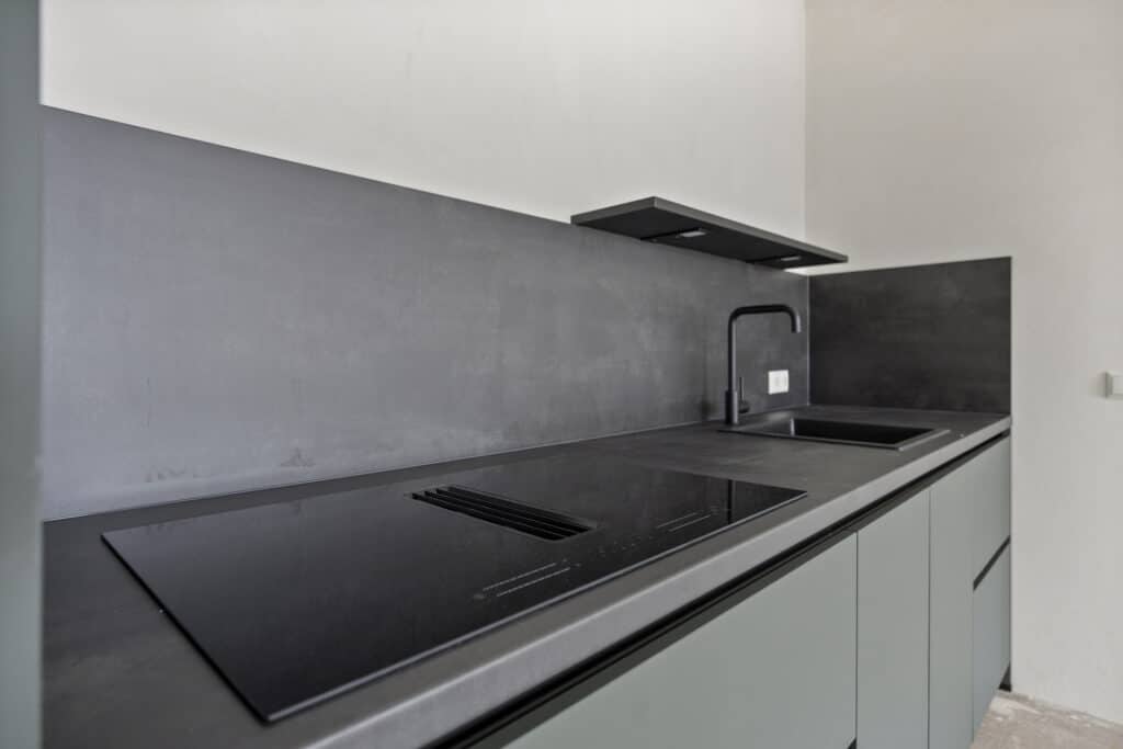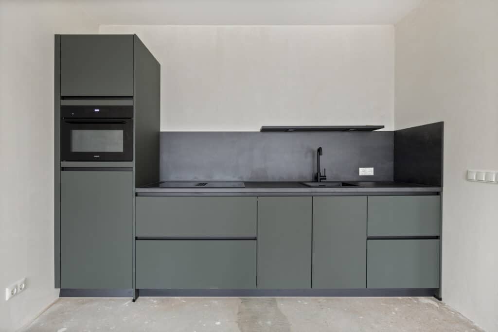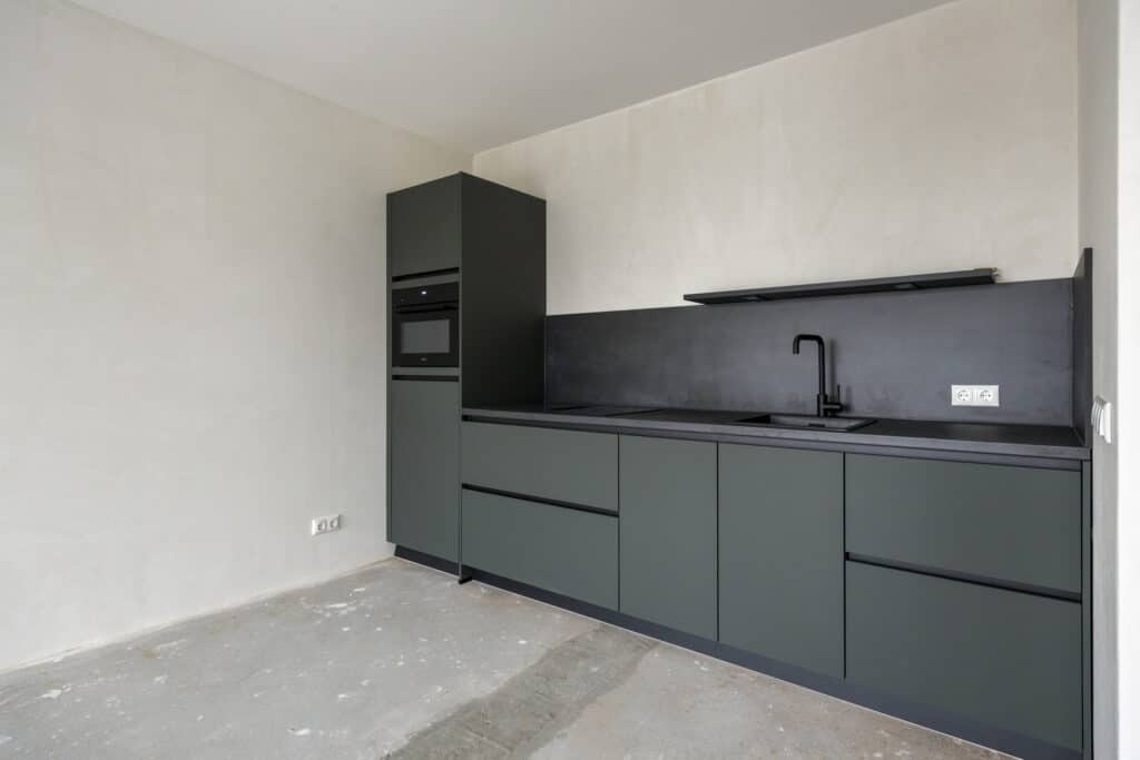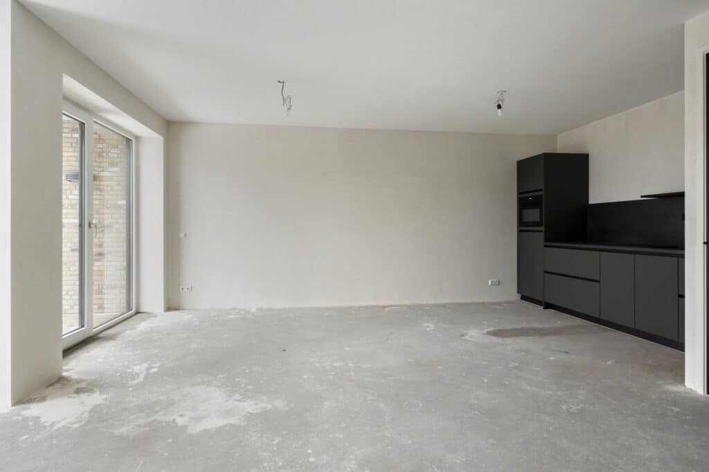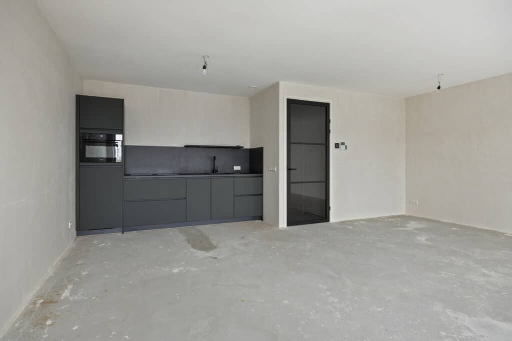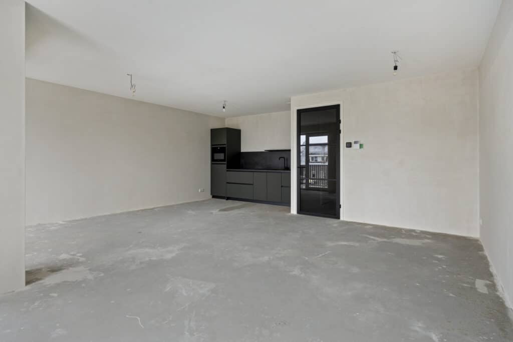 Aan de voorzijde van het appartement bevindt zich de lichte woonkamer met open keuken. De keuken is reeds geplaatst en vormt een verzorgd geheel met de leefruimte. Dankzij de grote raampartijen valt hier veel natuurlijk licht binnen.