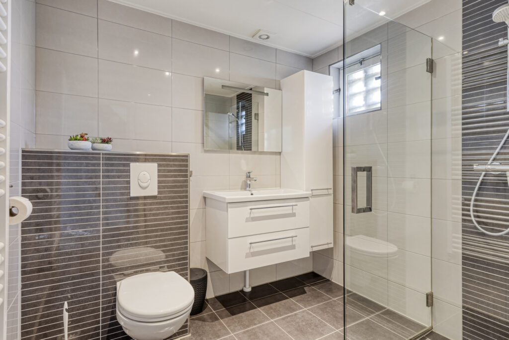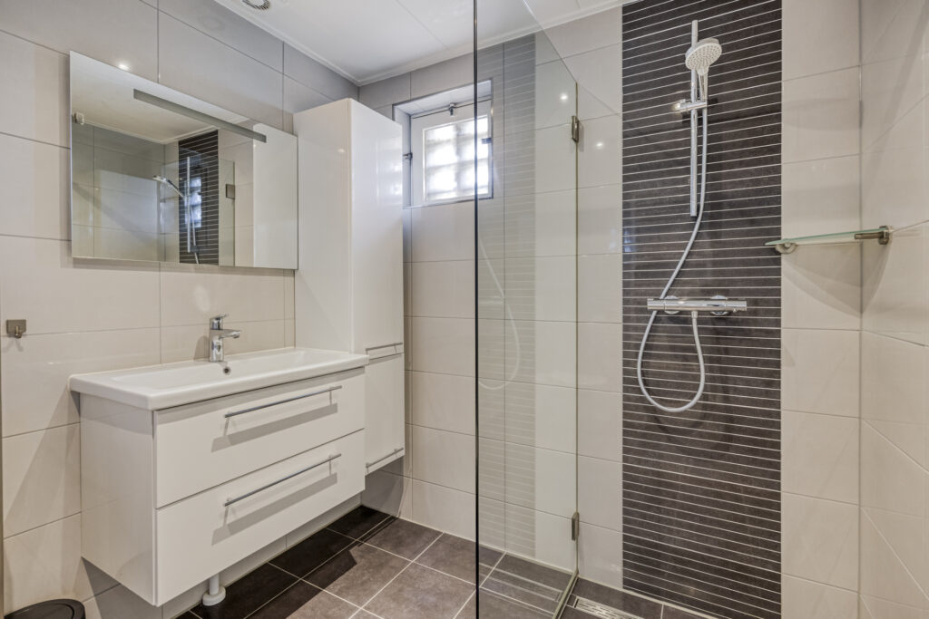 Op de eerste verdieping bevinden zich drie slaapkamers en een nette badkamer met douche, toilet en wastafelmeubel.